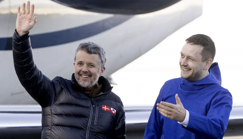 King Frederik, med både det danske og det grønlandske flag på genbrugsjakken, bliver her modtaget af formanden for Naalakkersuisut, Jens-Frederik Nielsen i Nuuk