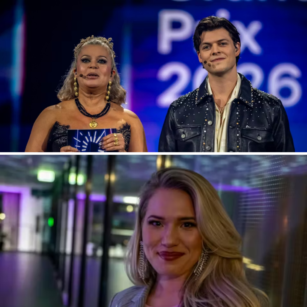 Den blonde kvinde og tidligere vinder af netop Melodi Grand Prix sad nemlig lige i kameraets vinkel .