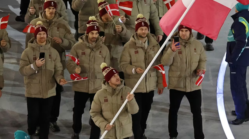 De danske repræsentanter bar nogle varme vinterjakker i en cremefarvet nuance, sorte bukser og huer på hovedet, hvor der stod Denmark.