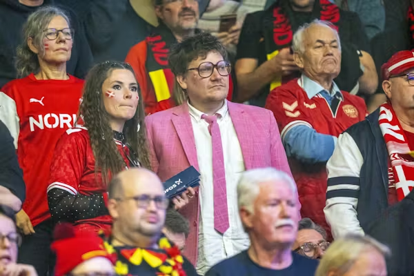 Sagen er, at den 41-årige komiker mødte op i pink jakkesæt og slips, da han og fruen var i Jyske Bank Boksen i Herning for at heppe på de danske håndboldherrer.