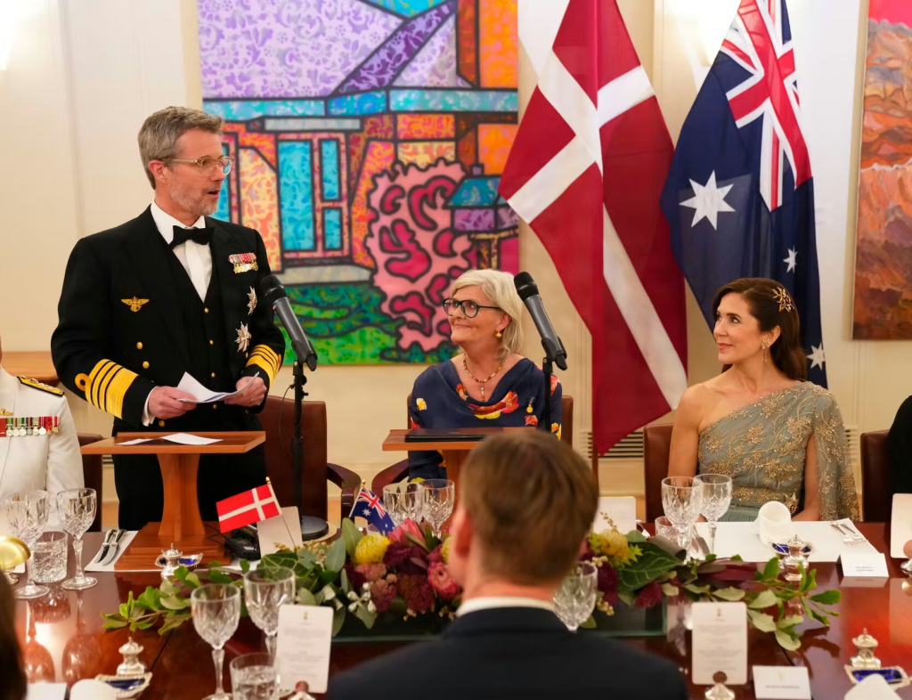 Kongeparret nyder i aften at være til statsbanket hos generalguvernør Sam Mostyn i Government House i Canberra.