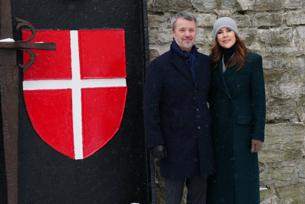 Kong Frederik og dronning Mary står foran markeringen af det sted, hvor det danske flag, Dannebrog, ifølge sagnet faldt ned fra himlen i 1219.