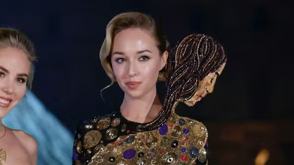 Prinsesse Maria Chiara var i et mere alternativt gallalook: Hun var hoppet i en ålestram heldragt, der var dekoreret i gylne toner, og øverst stak et perlebroderet hoved op ved siden af hendes eget hoved.