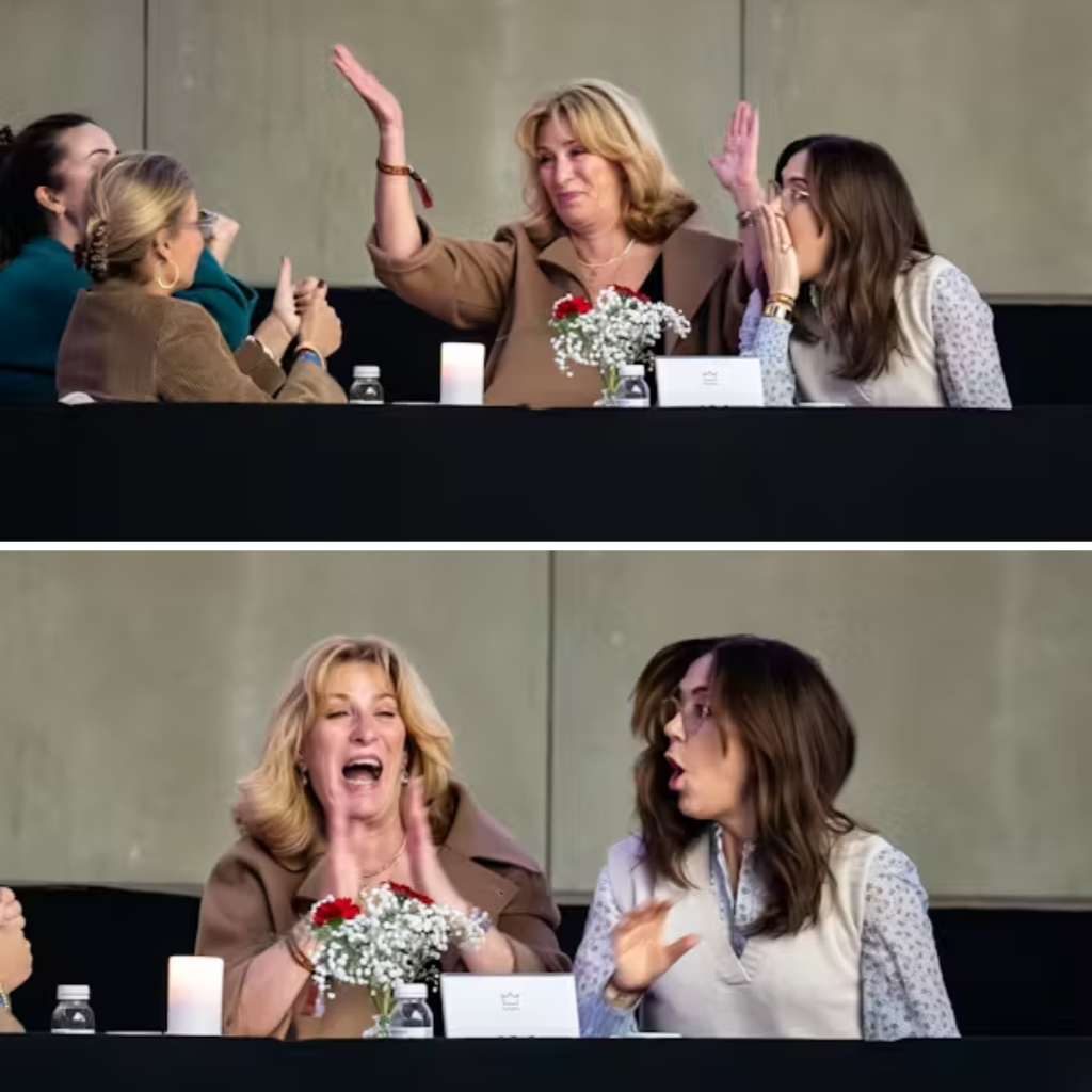 Dronning Mary jubler sammen med sine veninder Helle Krasnik Trolle og Malou Skeel fra tilskuerrækkerne, da Karin Nissens fem-årige unghest Versace Gold får toppoint.