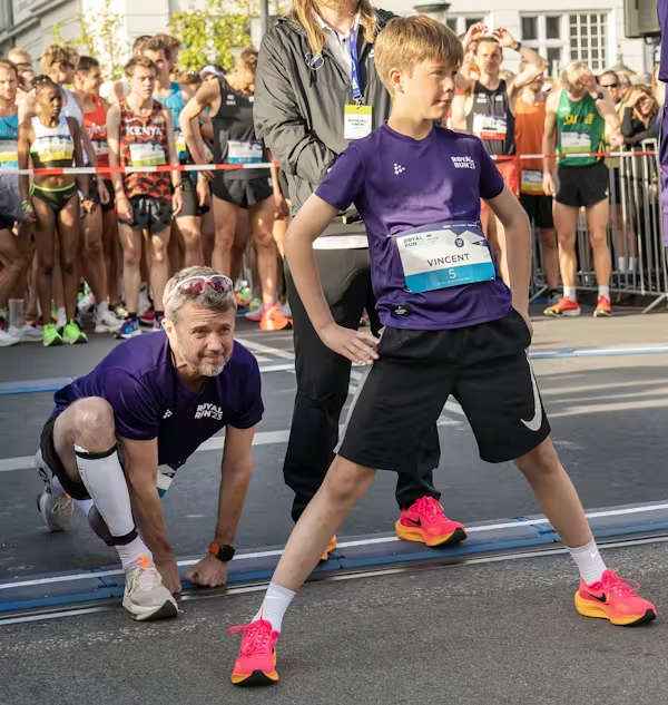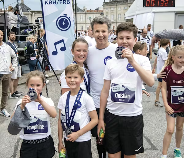 I 2020 var Royal Run aflyst grundet coronapandemien, så vi springer tilbage til 2019, hvor løbetrøjen var hvid. Her ses daværende kronprins Frederik med sine fire børn.