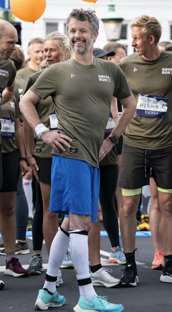 I 2022 var løbetrøjen olivengrøn, hvilket daværende kronprins Frederik fremviser på fornemste vis på billedet her.