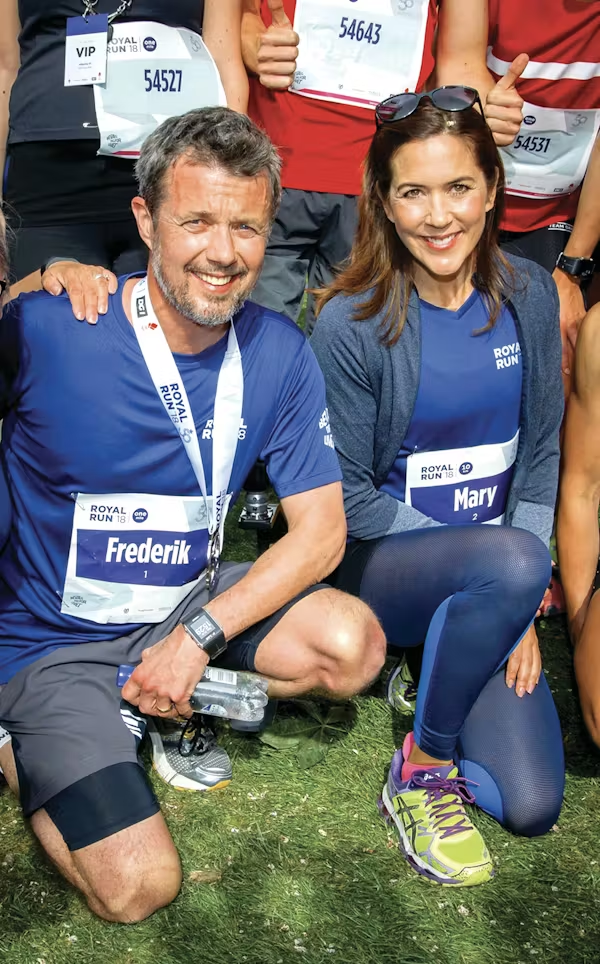 Da Royal Run fik sin debut i 2018, var løbetrøjen en flot blå farve. Her ses det daværende kronprinspar med store smil i Odense.